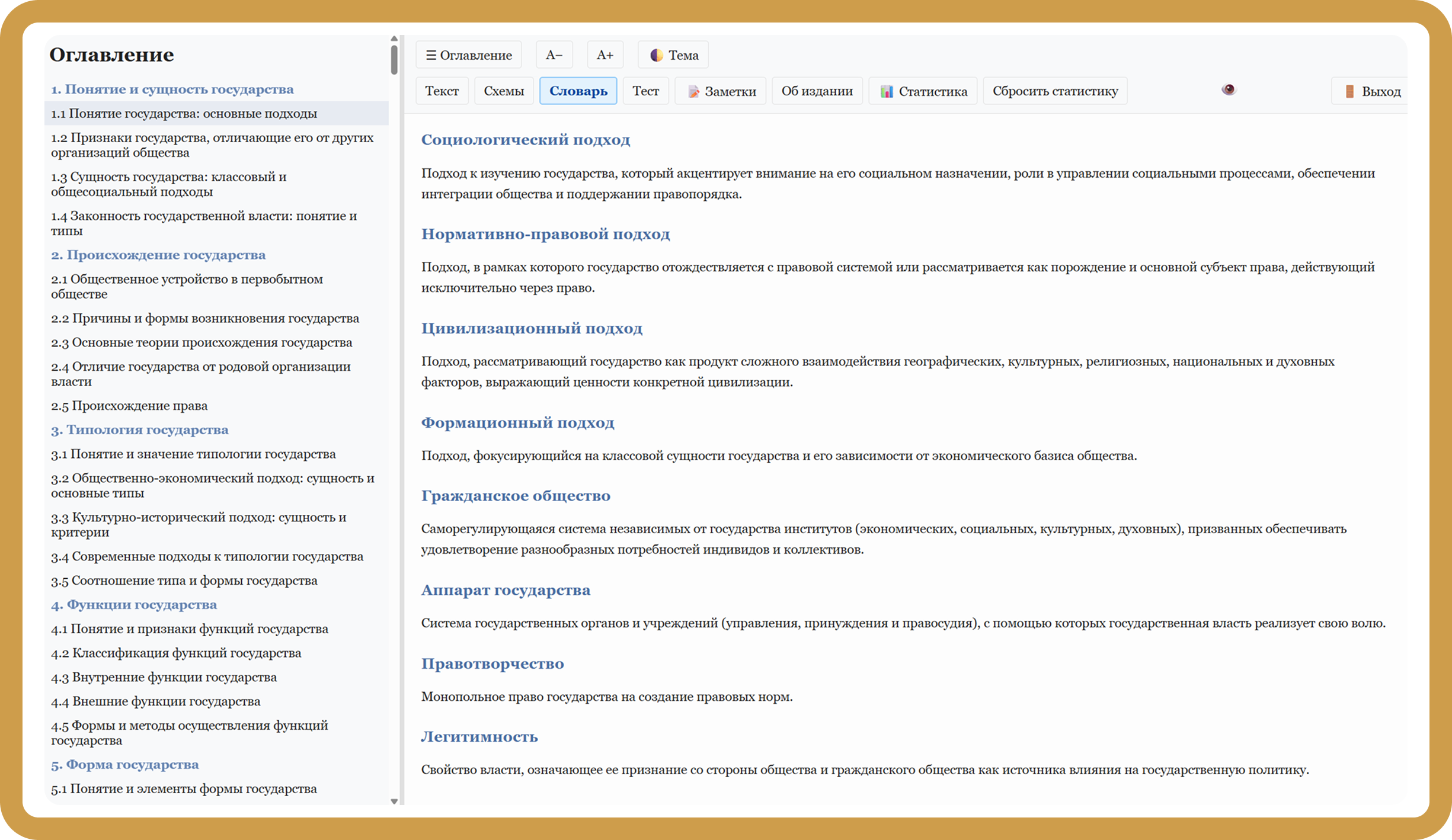 Вкладка «Словарь» автоматически загружает содержимое файла из папки «d» выбранного учебника. Материал представлен в формате Markdown с продуманной структурой: