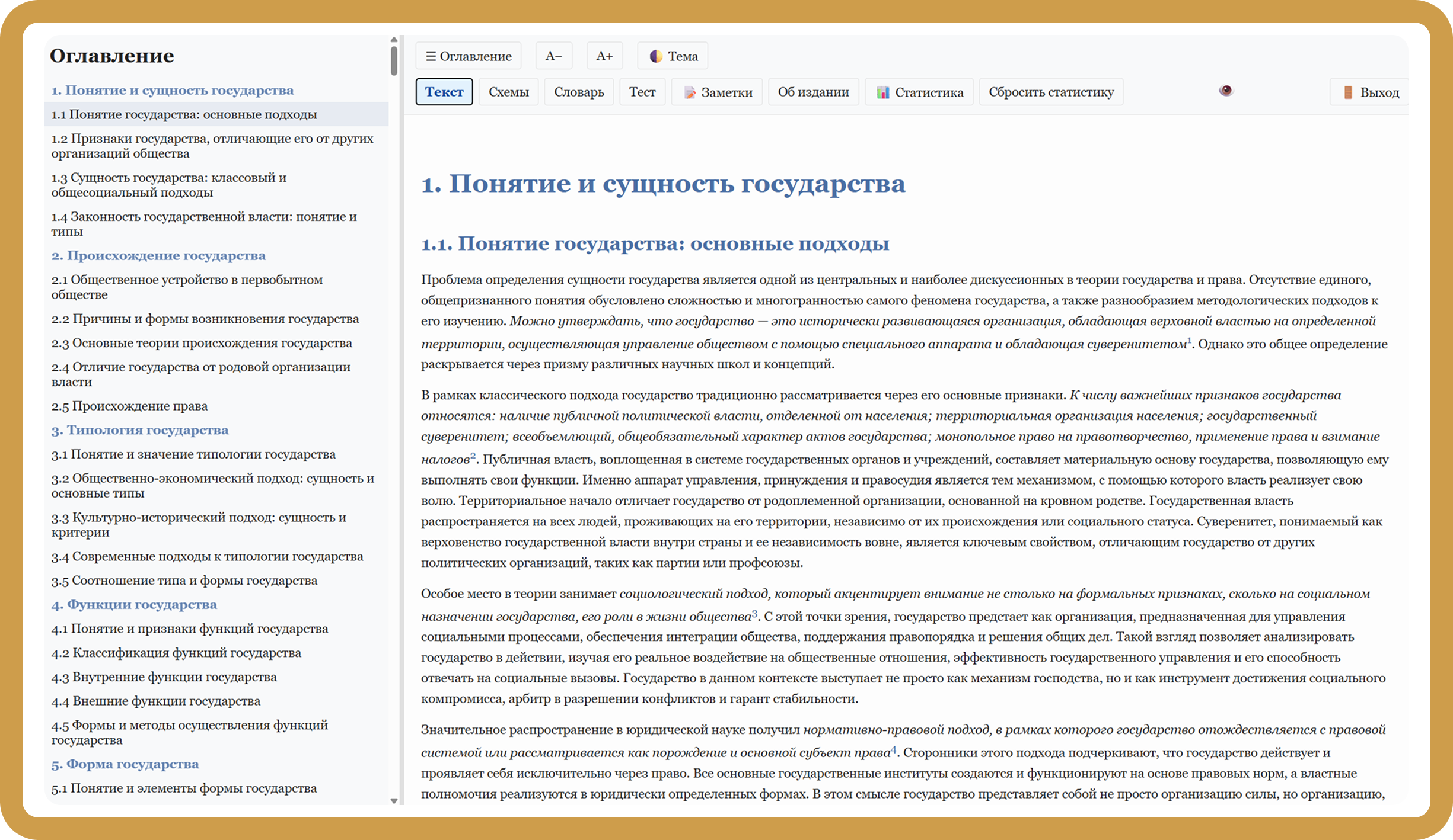 Вкладка «Текст» автоматически загружает содержимое файла параграфа из папки «s» выбранного учебника. Текст преобразуется из Markdown в форматированный HTML с сохранением всей структуры: