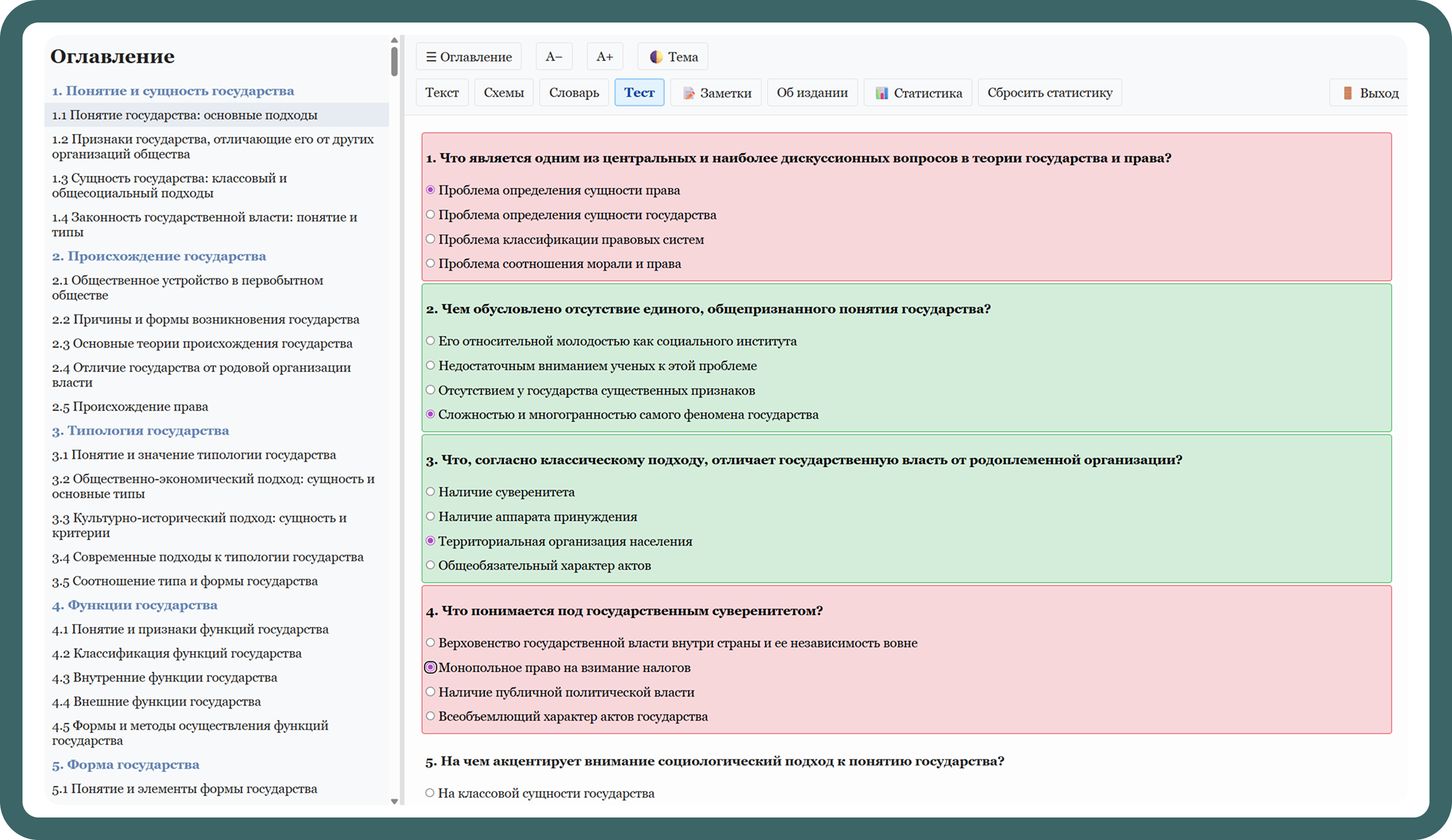 Если вы хотите пройти тест заново (например, для повторного изучения материала), вы можете сбросить всю статистику через кнопку «Сбросить статистику» в панели инструментов. Это действие удалит все данные о предыдущих попытках и времени изучения для всех глав текущего учебника.