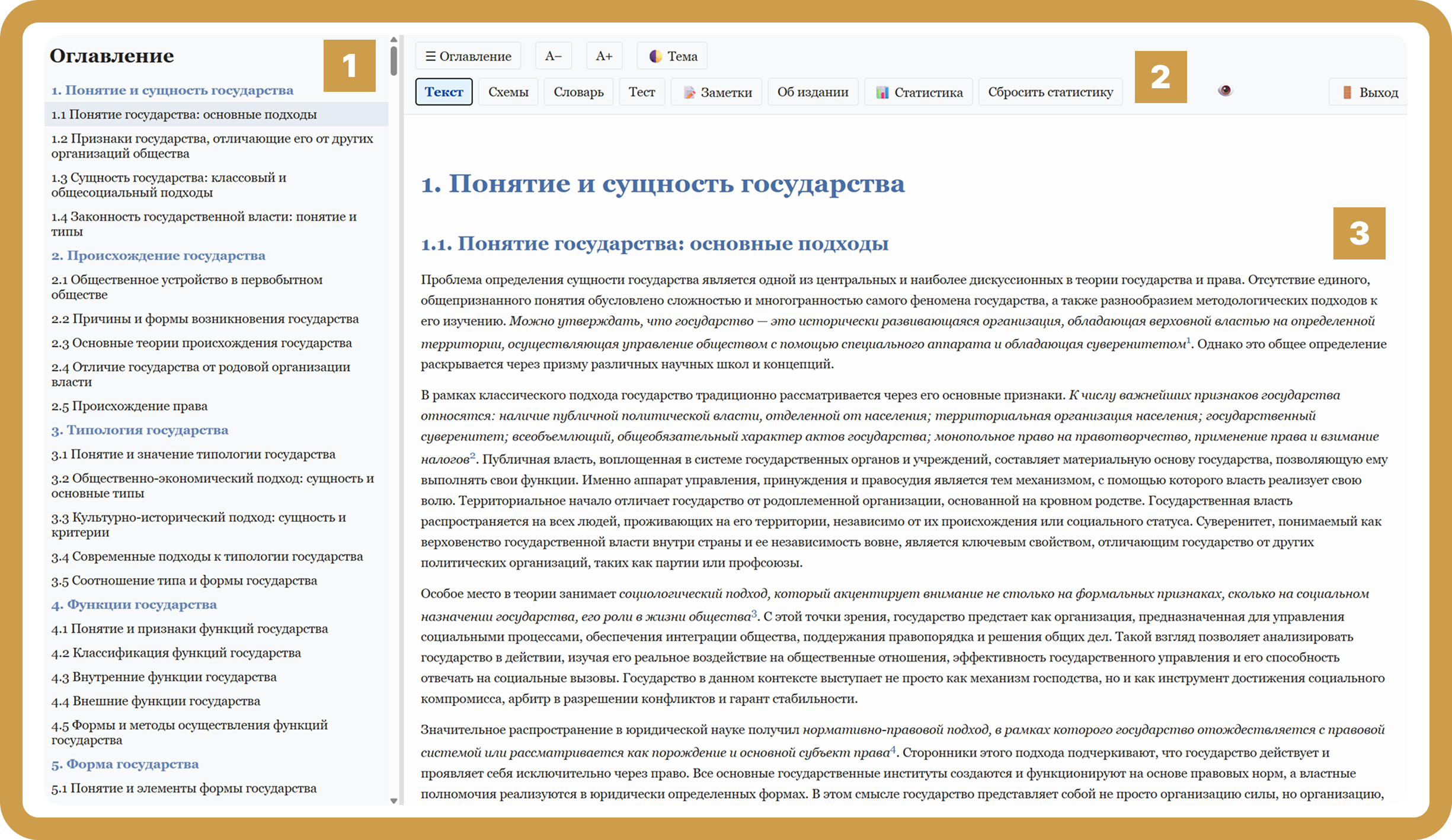 Панель с материалом отображает как текст учебника, так и схемы, тесты, сведения об издании, статистику, прочую информацию.